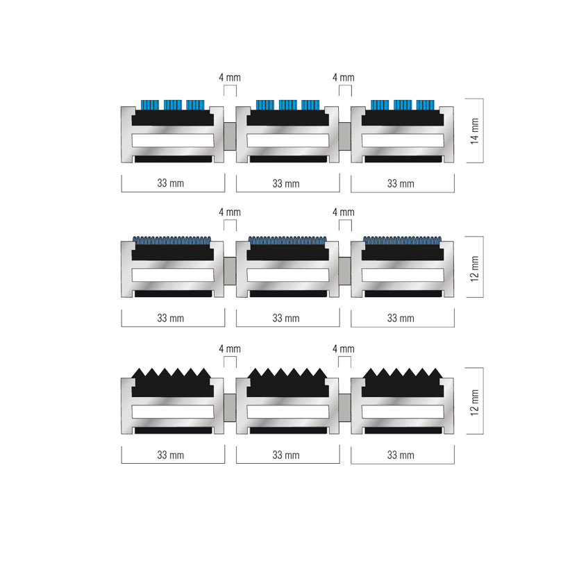 Perfil:la alfombra o se aloja en un perfil de aluminio, de excelente resistencia y son resistentes a todas las condiciones climáticas (+ 90 ° a -50 °).