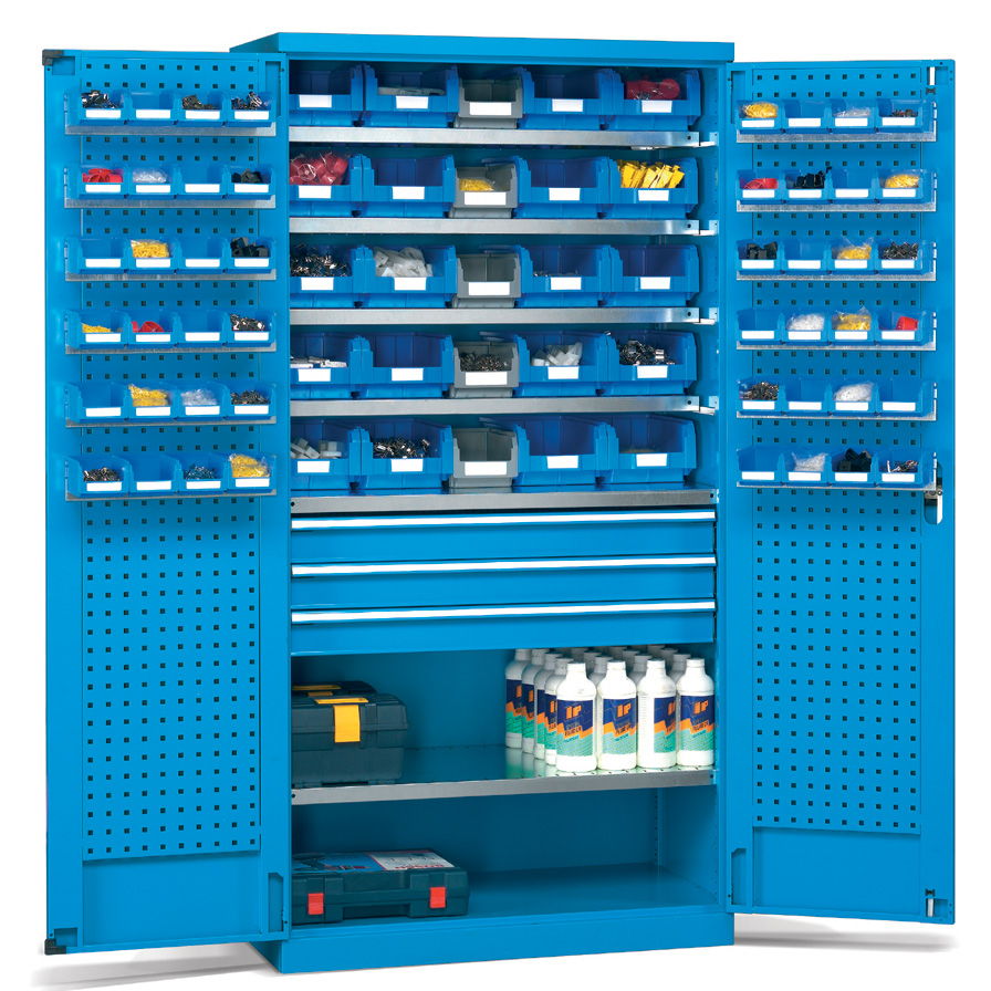 Los armarios metálicos para taller y oficina con cajones y puertas batientes de distintas medidas configuran un grupo de armarios pensados para el almacenaje y la custodia de elementos de pequeñas o medianas dimensiones y de pesos medios.