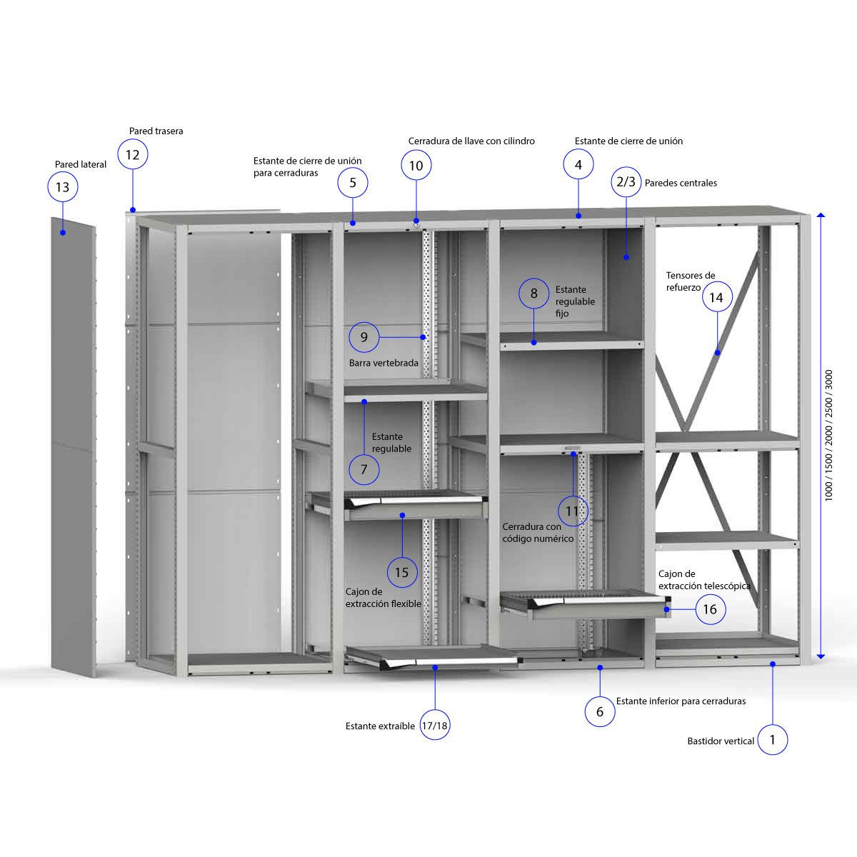 En la configuración de la estantería puede ir añadiendo diferentes elementos como estantes regulables, extraíbles, separadores verticales, cajones de extracción vertical, paneles posteriores, paneles laterales, diagonales, puertas batientes, correderas o módulos con persiana, elementos de separación para herramientas.
