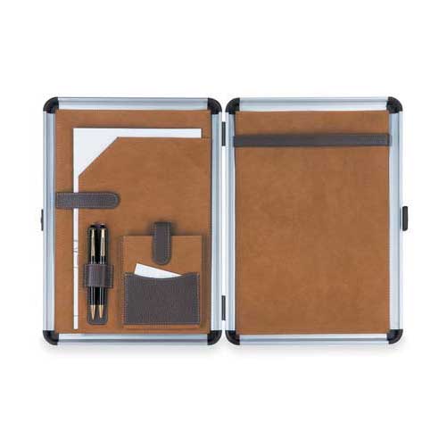 Maleta con marco de aluminio y esquinas plásticas redondeadas. Diferentes tipos de superficie disponible (ver tabla inferior). Bisagras plásticas en color negro o gris. Posibilidad de inlcuir logotipos o tipografías en los paneles.