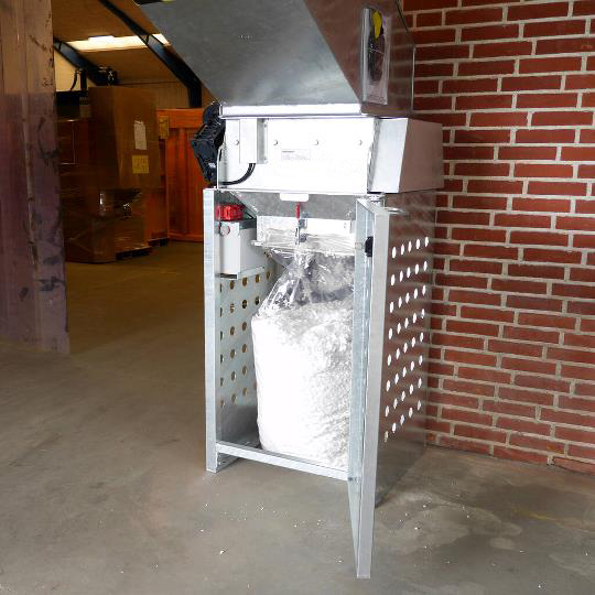 Gracias a una reducción de volumen de hasta un tercio, esta trituradora ayuda a optimizar el espacio de almacenamiento, reducir la manipulación manual y minimizar los costes en servicios de recogida o tasas de vertedero. Las bolsas se adaptan fácilmente al cono para una recogida higiénica y segura.