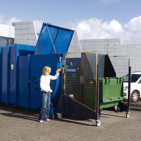 Además, el embudo y el ángulo de volteo, permiten utilizar diferentes tipos de contenedores, desde 80, 120, 240 y 1100 litros, con una capacidad máxima de 400 kilos.